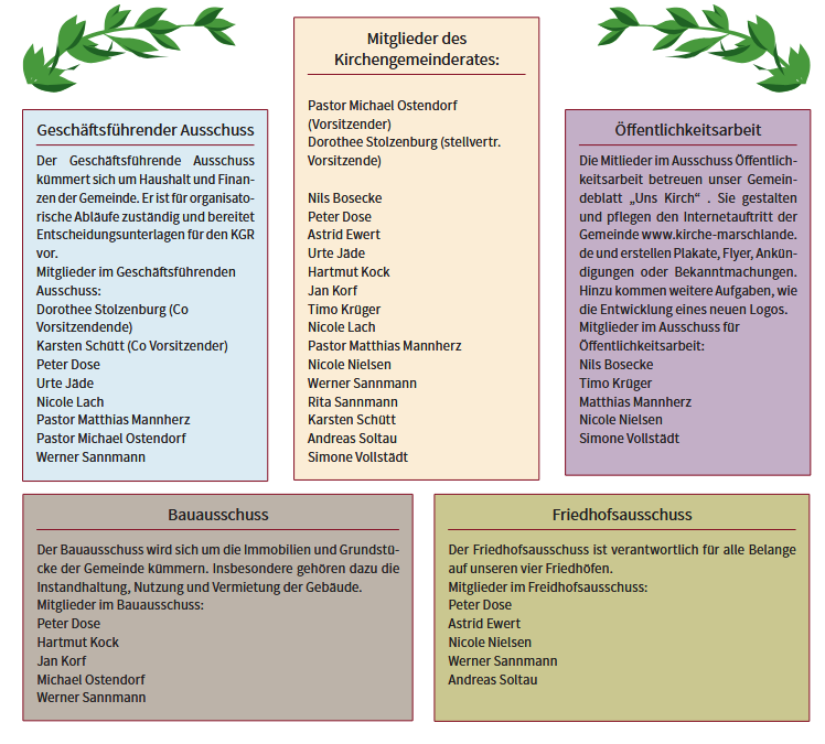 Zusätzlich zu den Ausschüssen wurden Arbeitsgruppen vorgeschlagen, die wir mit ihrer Besetzung in der nächsten Ausgabe von UnsKirch vorstellen werden. Bei den Arbeitsgruppen, im Unterschied zu den Ausschüssen, ist die Mitarbeit von weiteren Gemeindemitgliedern gewünscht und herzlich willkommen.